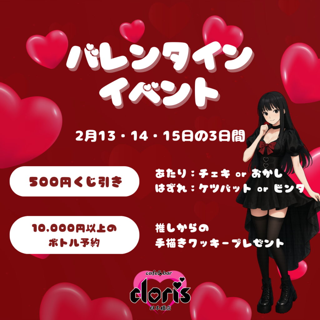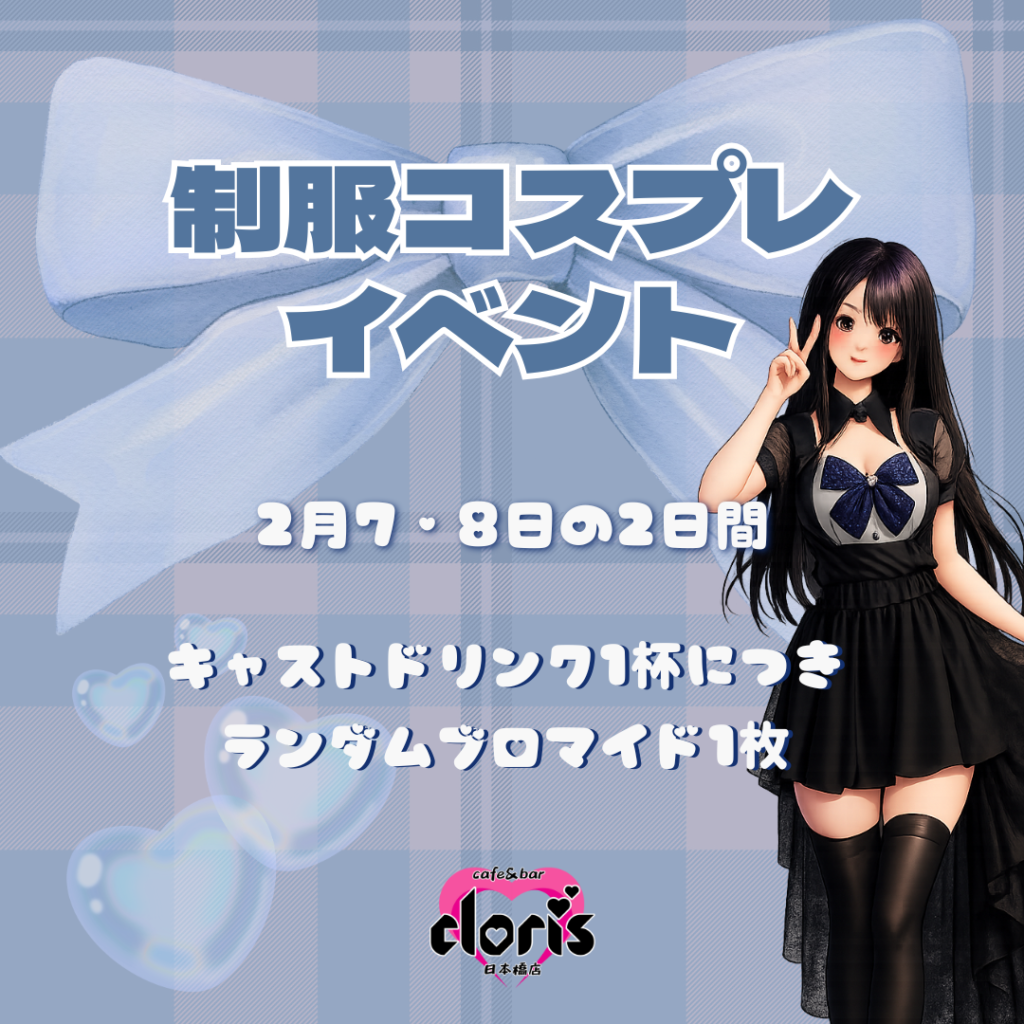 2月のイベント情報✨️ 投稿日: 2026/02/01 | カテゴリー: ブログ 2月7・8日の2日間限定で、キャストが制服を着てお出迎えする制服コスプレイベント 2月13・14・15日の3日間限定でバレンタインイベント 2月22日限定でキャストがネコの衣装を着てお出迎えするネココスプレイベント