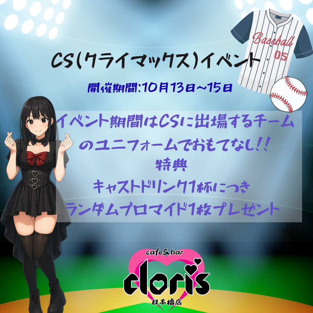 CSイベント開催 投稿日: 2025/10/13 | カテゴリー: イベント 10月13日~15日までの期間限定イベント! CSシリーズイベント開催! 出場チームのユニフォームを着用しておもてなし致します! 更に キャストDを1杯につきランダムでブロマイド1枚プレゼント。